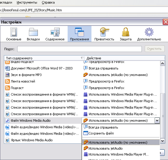 В «тип содержимого» ищем файл «Windows Media Audio» и выбираем проигрыватель,